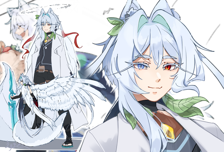 獣耳と尻尾、頭上に鱗の輪、背に1対(大)に腰に1対(小)の翼、うなじから葉が生えている。右耳には葉がついたイヤカフを装着。